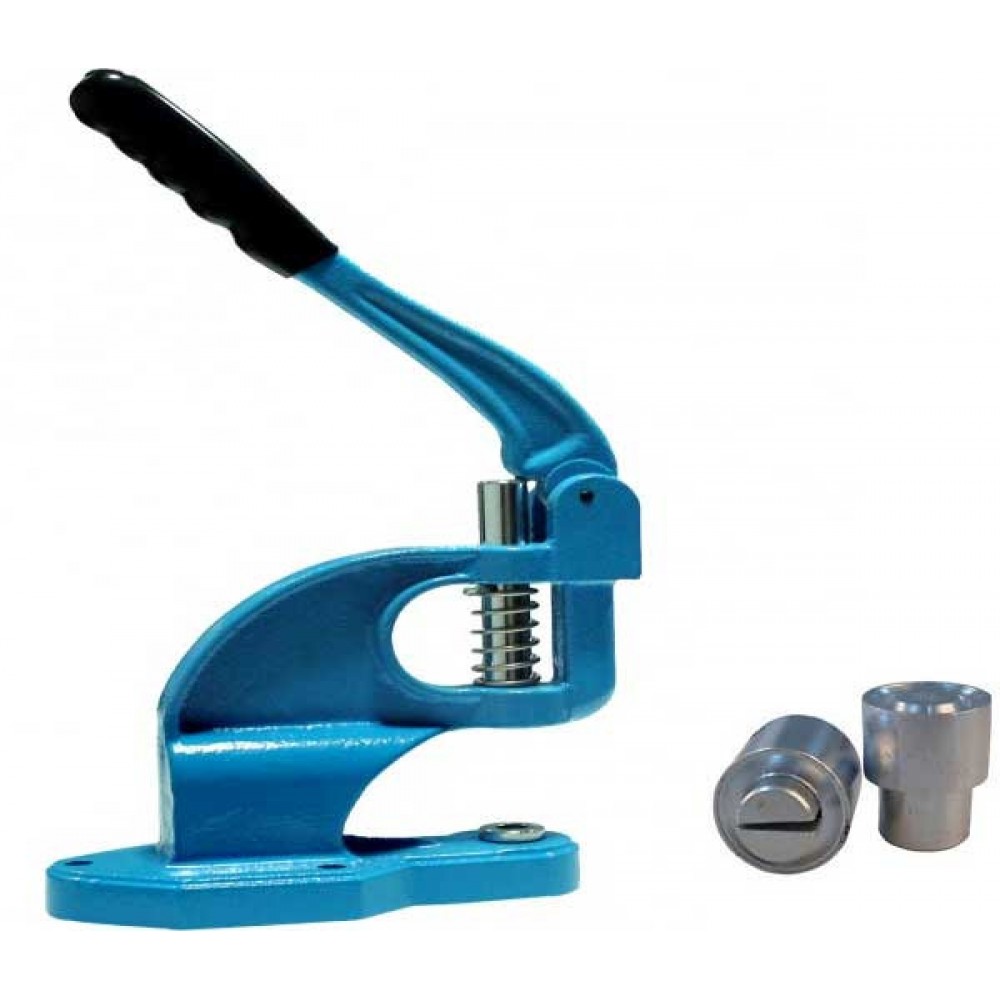 Máquina de cravar ilhoses manual para furações com diâmetros de 12mm, ideal para lonas e telas é utilizada com ilhoses de chapa de vela zincada (composta por macho e fêmea) para impedir a sua oxidação.